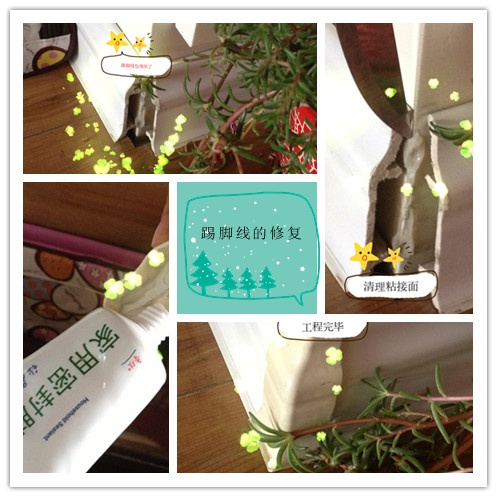4、踢脚线。当时装修的时候我就坚决反对使用,但装修公司说不用不美观,同时说大家都使用,于是又一次从众使用了这种塑料的东西。平日里要经常擦拭,一个星期不抹就有灰尘落上,后悔晚矣。第七年的时候,这个多余的装备开始闹情绪,纷纷主动下岗。在经常走动的门厅、鞋柜和卫生间三个地方,当初安装的拐角直接掉下来了,不修真不行了。于是开始的时候用水泥修了一次,但颜色真不好看但修上了。今天又有一个地方想掉,干脆我自己把它掰了下来,试试用家用密封胶粘一下,没有想到效果超级棒哎。